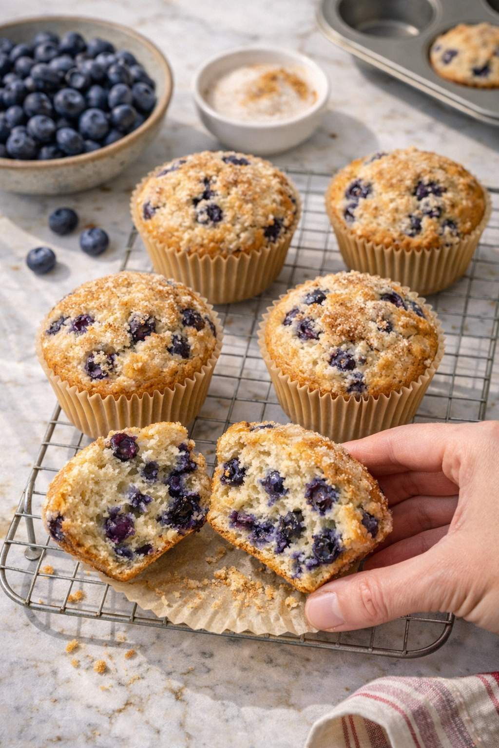 These muffins are tall, fluffy, and bursting with juicy blueberries in every single bite. The tops get this beautiful golden dome with just the right amount of crunch from the sugar topping.