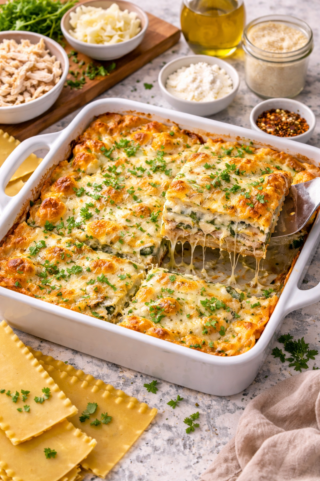 4. Season every layer. This is where so many lasagnas fall flat. Every layer needs salt and pepper — the noodles, the chicken, the sauce. Taste as you go.