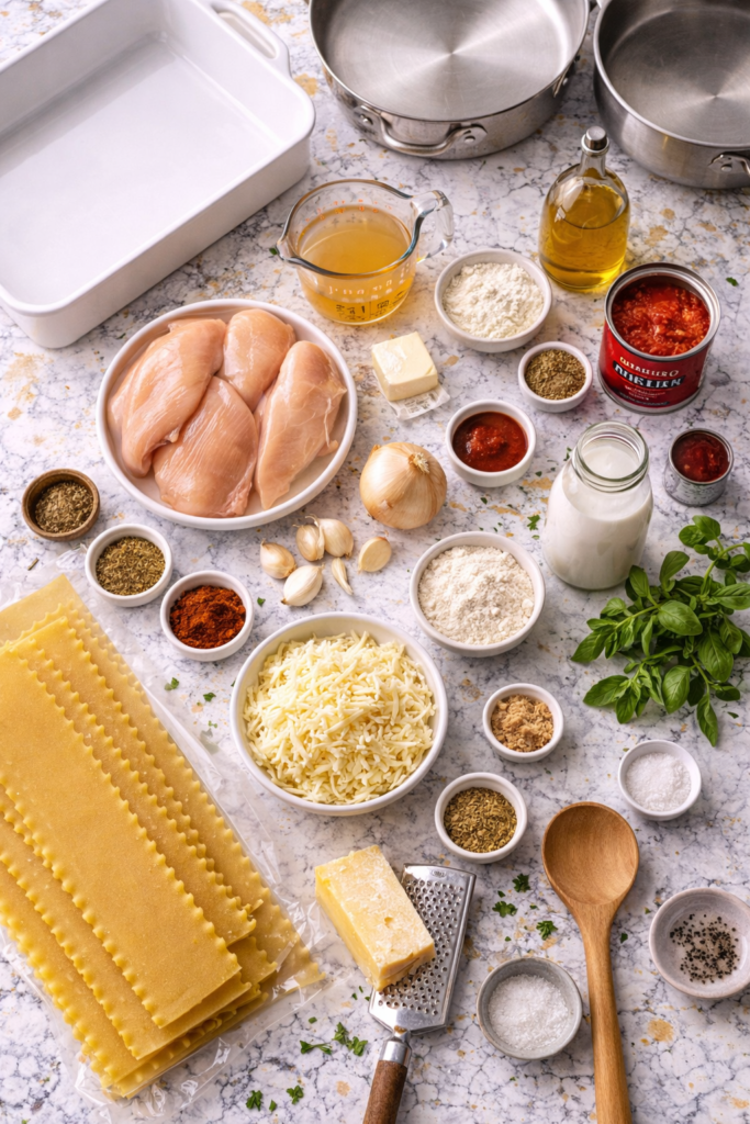 Most chicken lasagnas end up tasting a little bland. The fix? A rich béchamel sauce and properly seasoned chicken that’s cooked with aromatics before it even touches the dish.