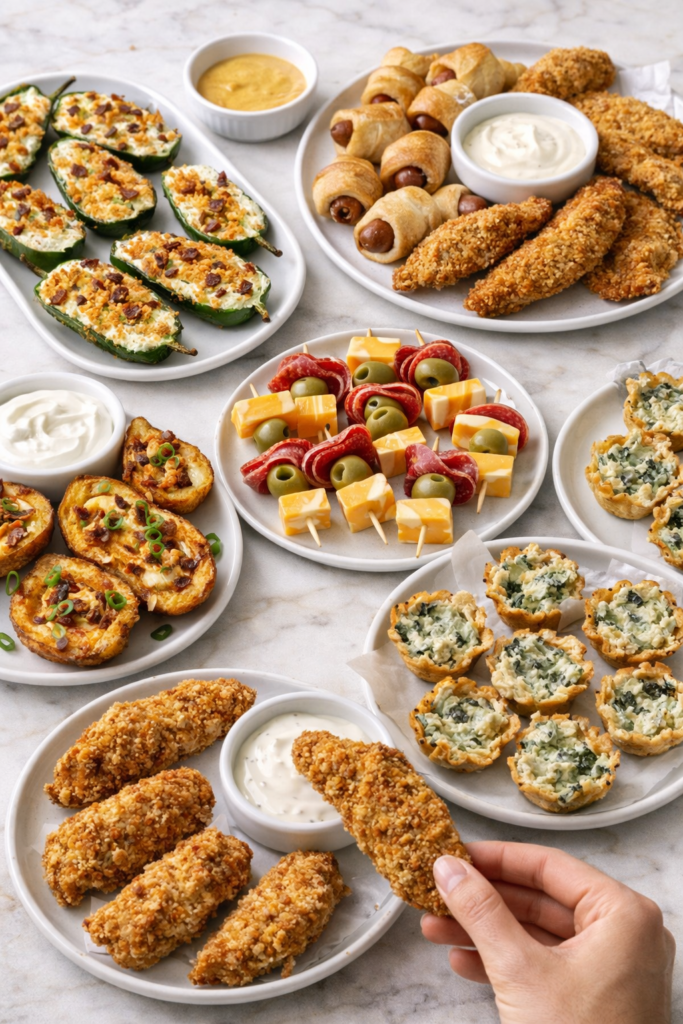 - Other finger foods: Buffalo wings, mini sliders, veggie skewers, cheese boards