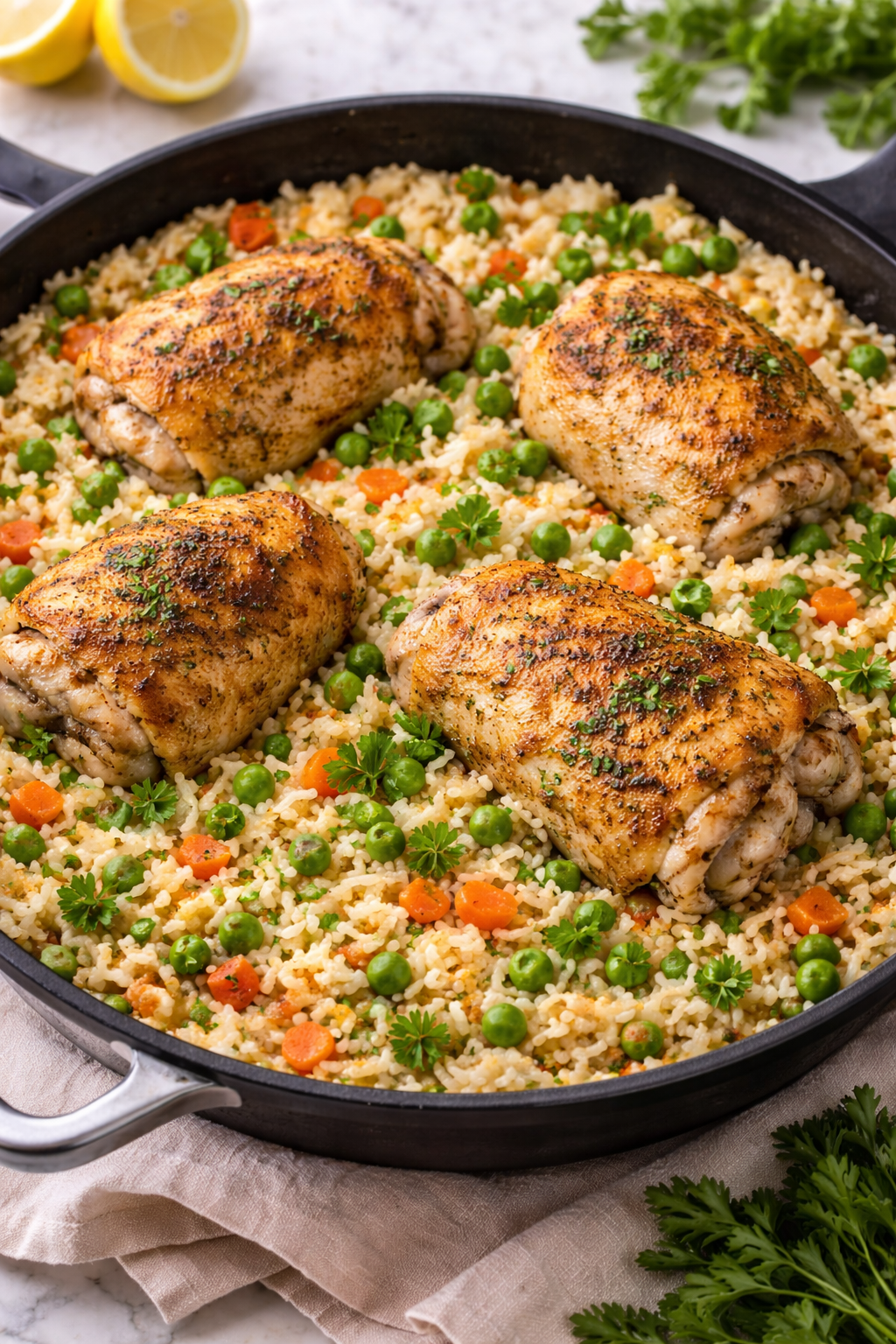 Chicken thighs provide iron and zinc. Brown rice adds fiber if you swap it in. The vegetables bring vitamins and antioxidants. This is a genuinely balanced meal that doesn’t feel like you’re being virtuous.
